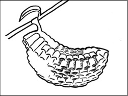 図Dが、キアシナガバチの巣です。この図がそのまま横向きに作られることもあります。スズメバチの巣のような外被はありません。これは巣の材料が異なるからで、比較的、水への耐性もあります。