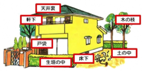 一つの例ですが、静岡市のホームページには、「スズメバチはこんな所に巣を作ります」のタイトルで右のような絵が掲載されています。